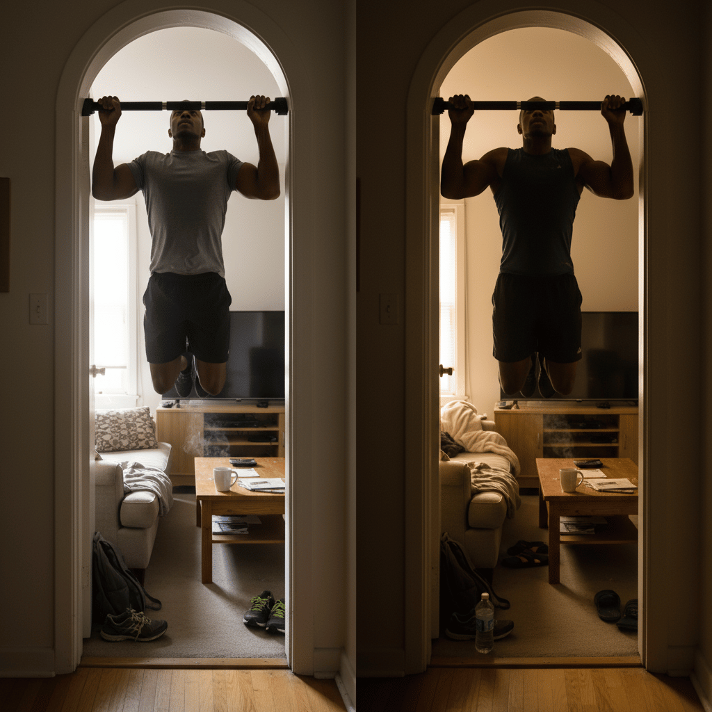 Transform your daily routine with morning pull-ups or pre-bed strength training. No gym membership needed – just consistent habit building in your own home.